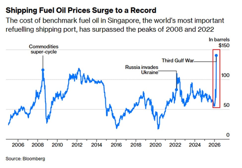 The result is not a classical supply crisis, but a price formation crisis. Infrastructure exists, production capacity exists, alternative export routes exist - trust does not. Confidence or the lack thereof has become the most expensive commodity of all. Consider Singapore’s fuel prices, which have spiked to $140 per barrel, a 146% increase year-to-date, surpassing peaks seen in both the 2008 financial crisis and the 2022 energy crunch. Fujairah, a key port just outside Hormuz, sees fuel types trading as high as $175 per barrel, while West Texas Intermediate sits at roughly $195, meaning refined fuel now carries a 40–75% premium over crude.